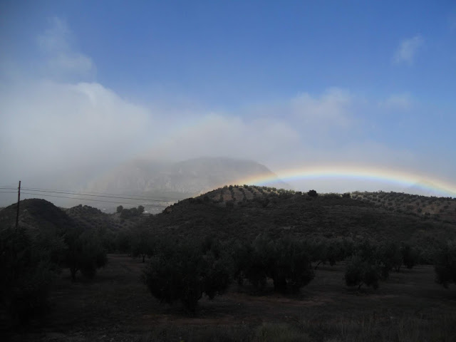 La lluvia no tardo mucho en hacer acto de presencia, era algo que teníamos asumido en este viaje, donde nos mojaríamos si o si, aunque de momento nos respetaba algo, tan solo fueron varios tramos donde era una pequeña capa de agua la que caía y en otras una neblina nada preocupante, eso si, nos dejo estampas como esta donde se apreciaba con total claridad el arco iris.
